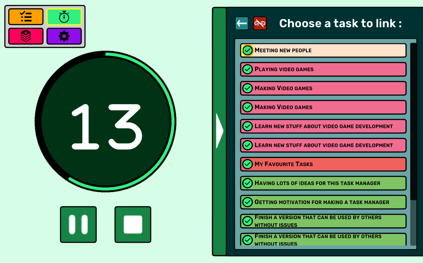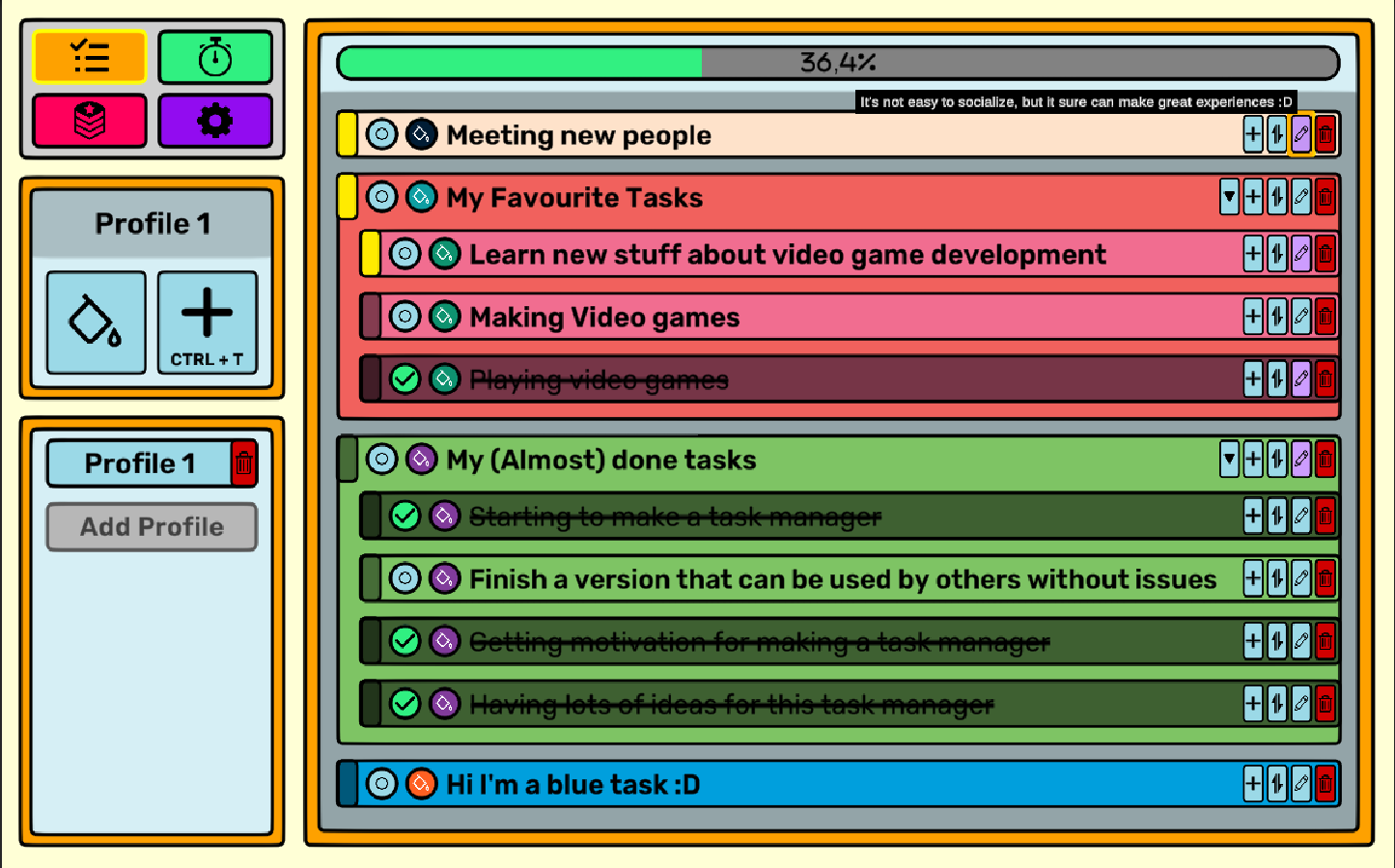 After trying to get an internship to validate my second year of the BUT program, I went to visit my older sister during the summer of 2024. I wanted to make my time useful by working on a project that was a bit different from video games, but still developed in Unity. That’s why I became interested in ADHD (Attention Deficit Hyperactivity Disorder). Several people around me, including my sister, are affected by this condition. Since organization and the seek for dopamine are recurring concerns for these people, I decided to develop a task manager focused on providing satisfaction through different methods (visual feedback, audio feedback, customization, rewards, etc.). So for two months, I worked on this software while gathering as much feedback as possible from the people around me who were directly concerned.