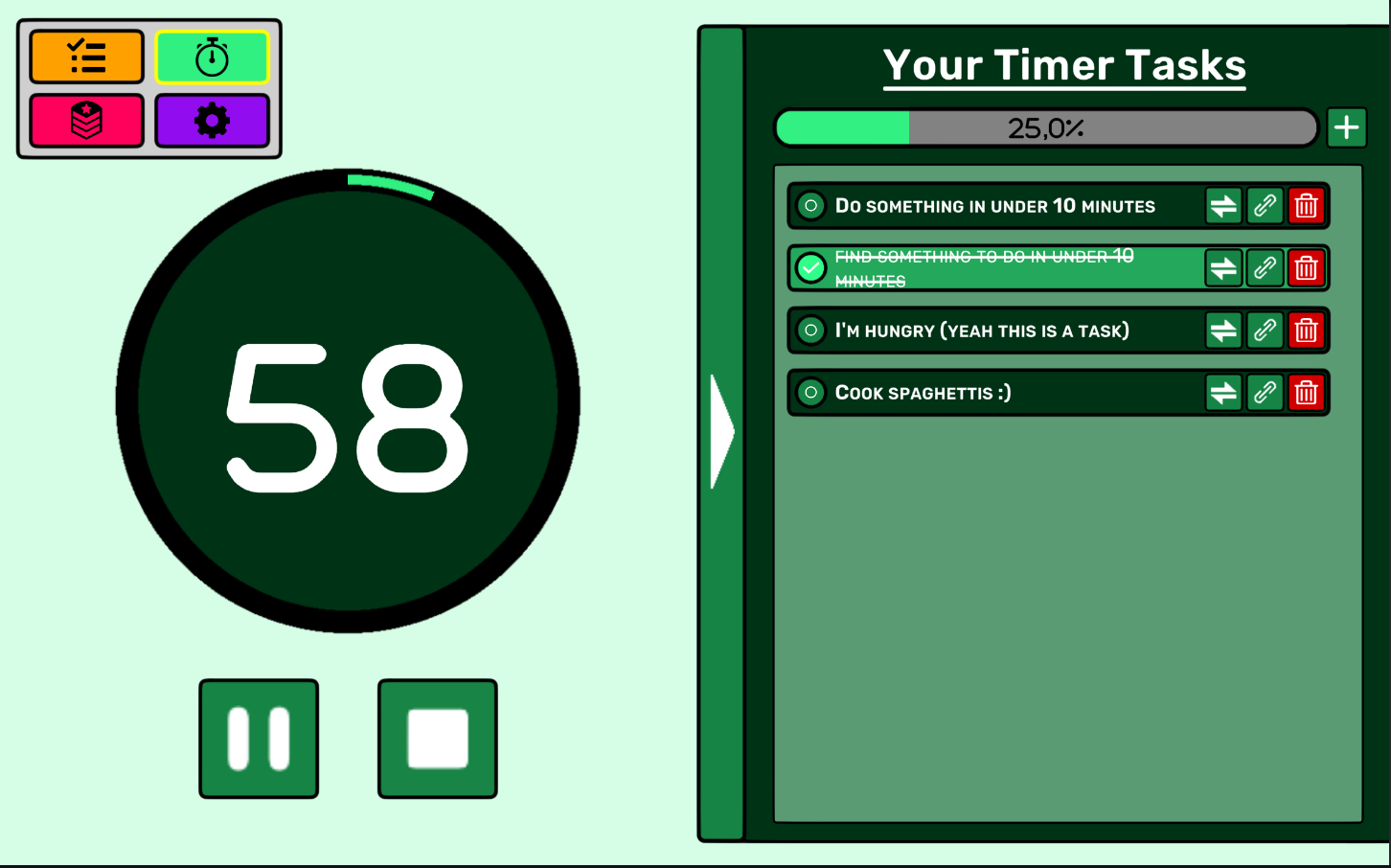 - Timer Tab (3): A space to time yourself while working on tasks (inspired by the Pomodoro Timer),